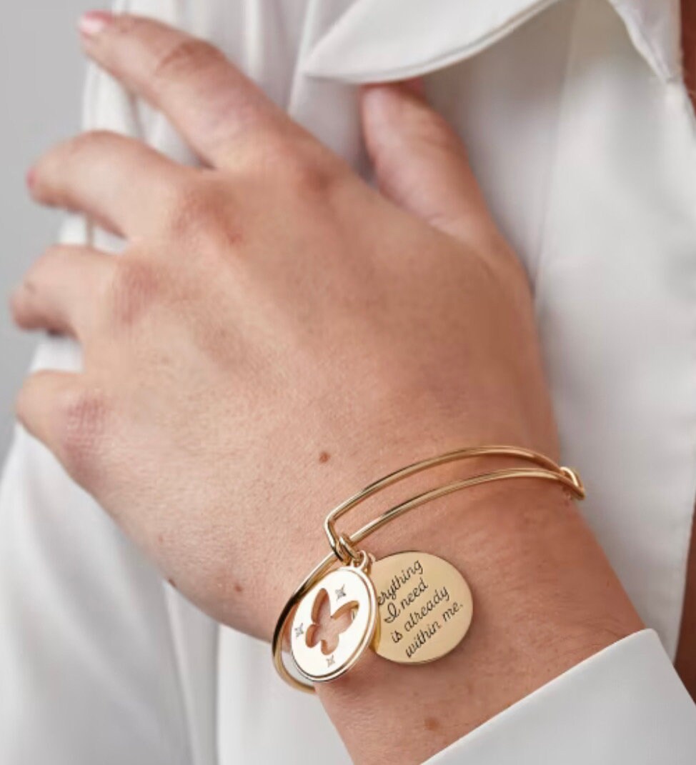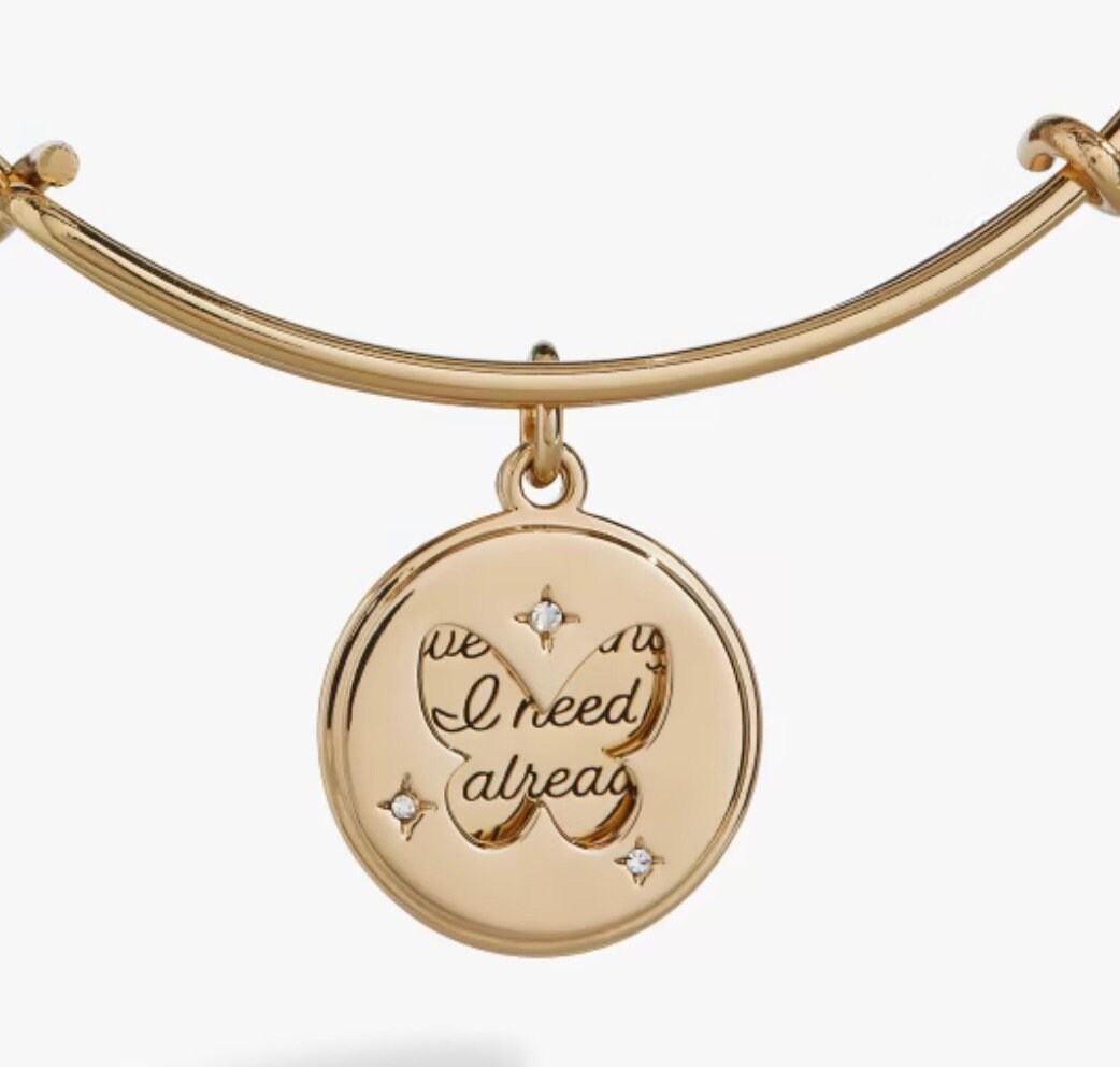 Meditate on your affirmations daily to soak them into your very essence. This gold affirmation charm bangle features a charm inscribed with "Everything I need is already within me." Slide the cut-out, crystal-embellished butterfly charm to reveal the entire affirmation. With elevated detailing, this expandable charm bangle can be stacked for everyday wear or stand alone on your night out look.