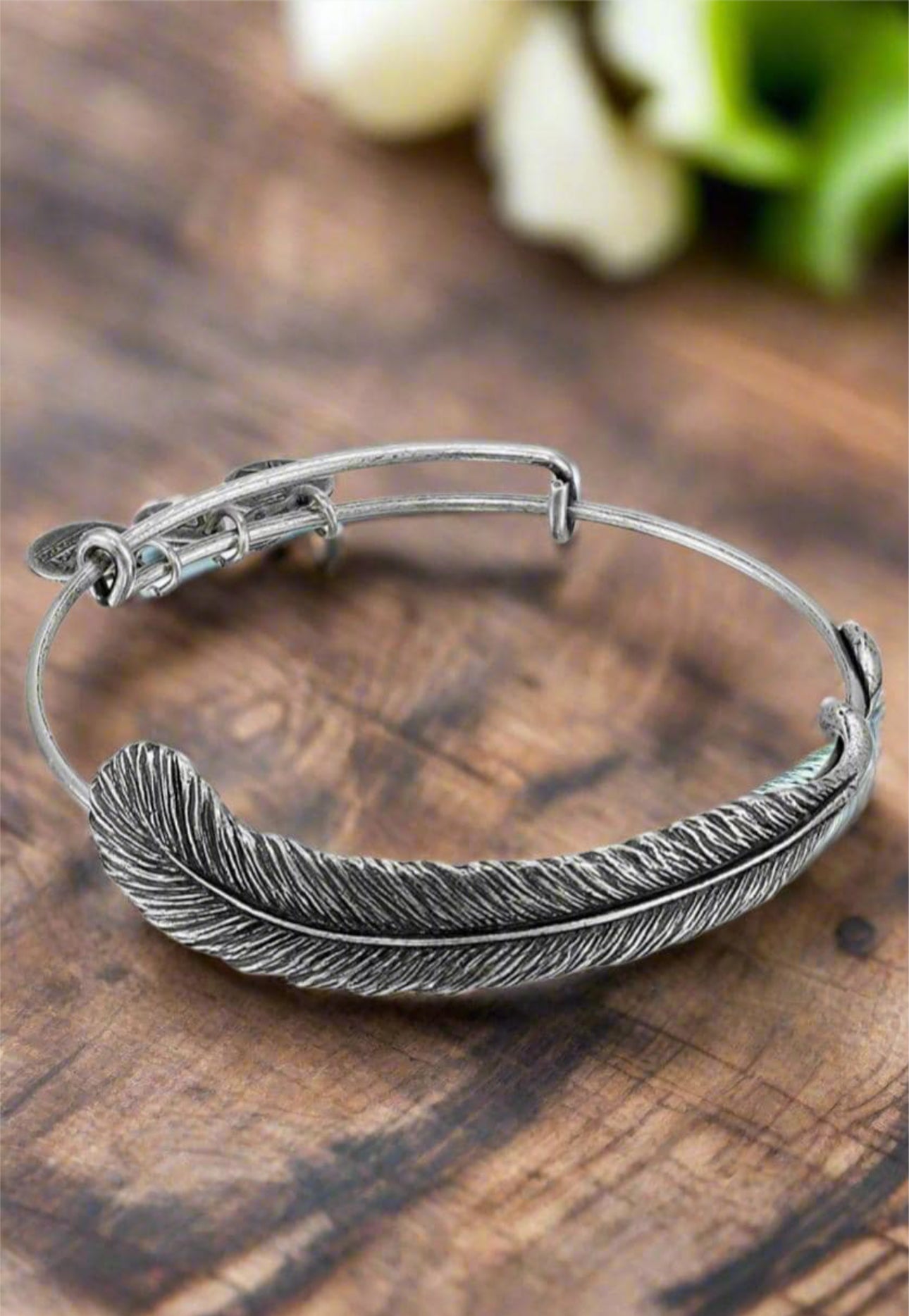This is part of the “Spiritual Armor” collection. It is handmade bangle bracelet crafted from recycled material that is Rafaelian Gold or Silver and it features plume feather accent with the stamped smaller charms.