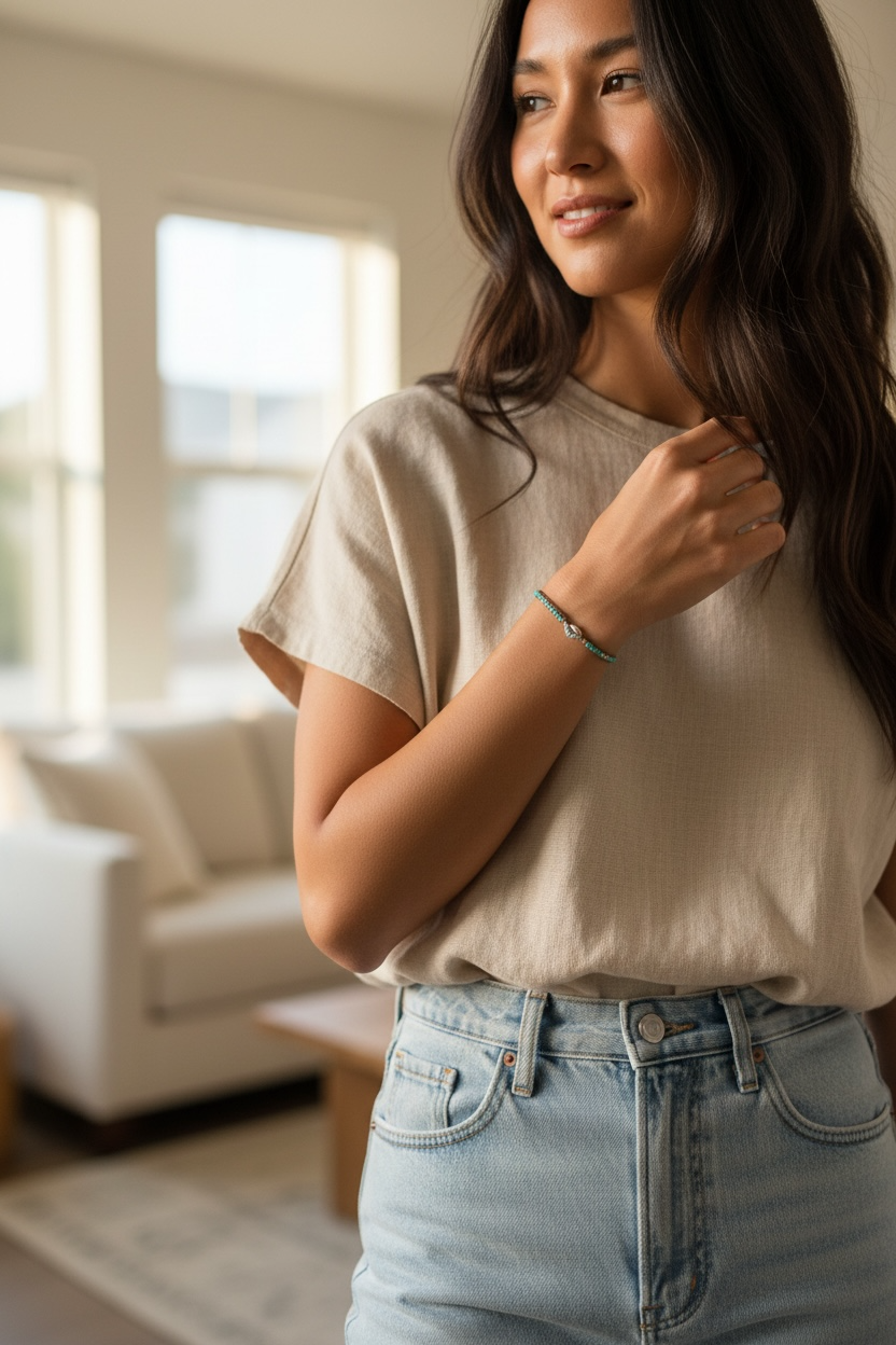 Chan Luu Sterling Silver & Turquoise Micro Mini Beaded Pull Cord Bracelet. Vintage Handcrafted, featuring a sterling silver shell and beads plus turquoise gemstone beaded adjustable bracelet.