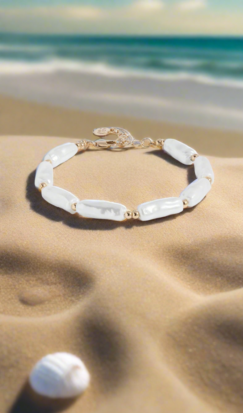 Take only inspiration from nature and leave the rest. This ocean-inspired Stick Pearl Bracelet will perfectly complement your stack with elegant, organic elongated pearls and shiny gold beads on an adjustable chain.